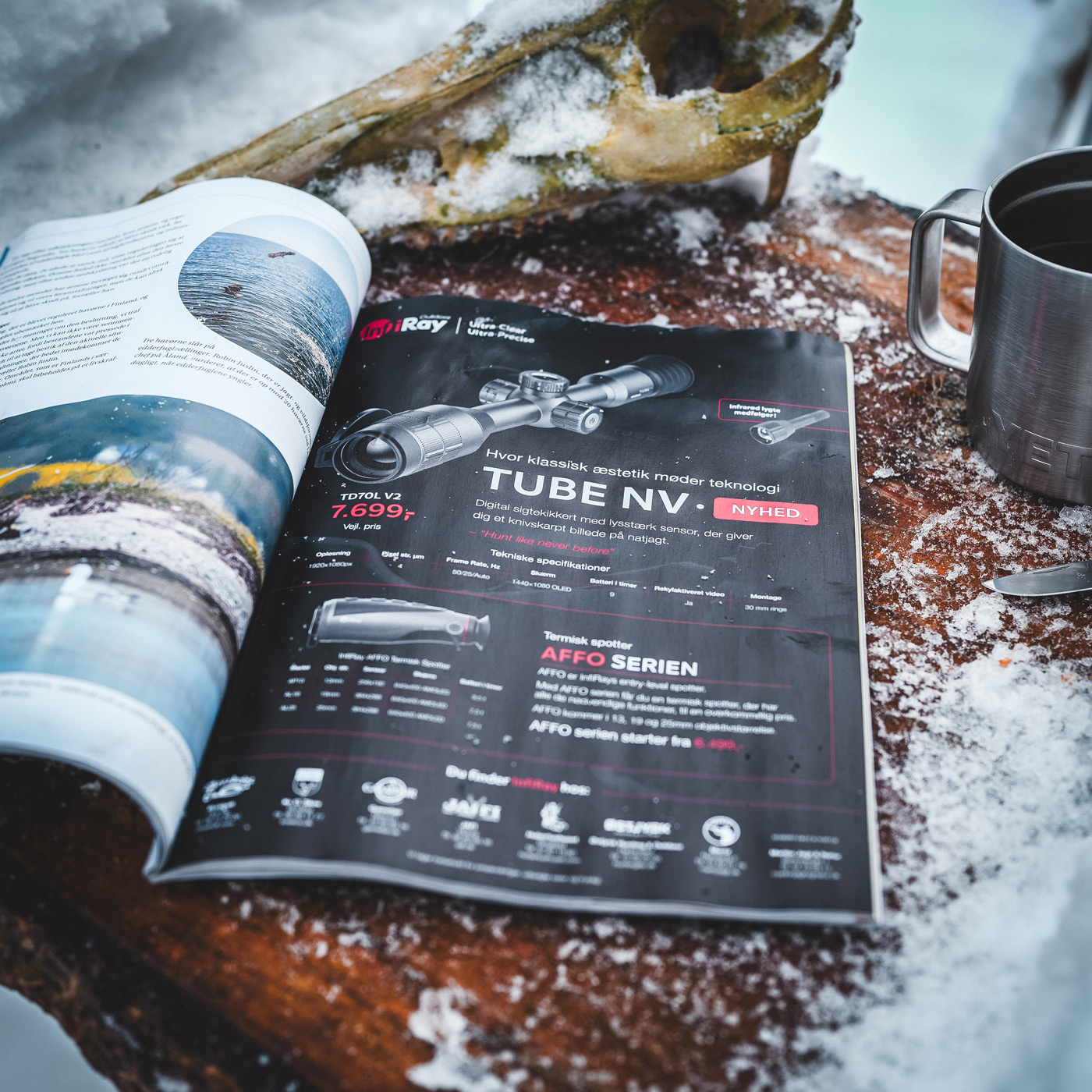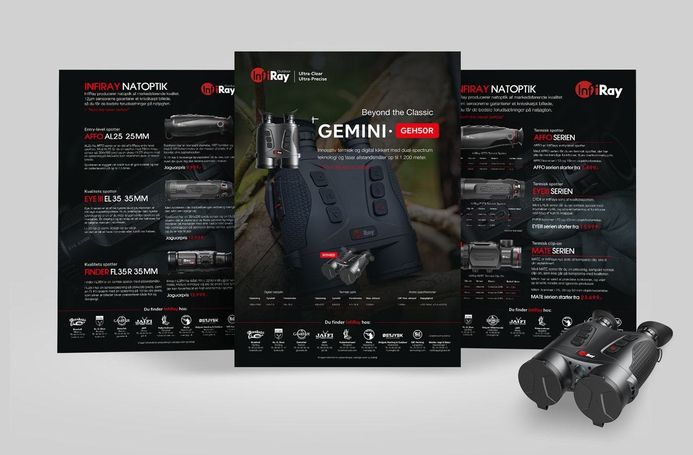 Annoncering i danske jagtmedier, som følger InfiRays visuelle identitet.